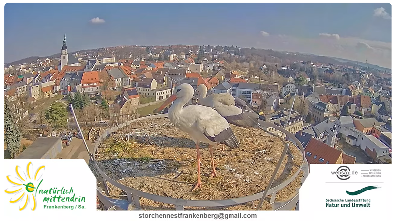 Hintergrund: Die Storchenfreunde vom Verein "Frankenberg/Sa. natürlich mittendrin e.V." präsentieren einen Liveblick ins Frankenberger Storchennest. Das Nest befindet sich auf einem 35 m hohen, stillgelegten Schornstein auf dem Werksgelände von Innotex Merkel & Rau GmbH in Frankenberg/Sa. Die Störche brüten hier seit 2019 und seit der Brutsaison 2025 können wir sie Live dabei beobachten.