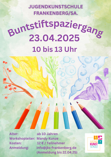 Einladung zu einem Ferienworkshop mit der JugendKunstSchule – der „Buntstiftspaziergang“, am Mittwoch, den 23.04.2025, von 10 bis 13 Uhr. Dieses Angebot richtet sich an Interessierte ab 10 Jahren – und ist ein explizites Angebot für Kinder und Jugendliche, gern in Begleitung für ein gemeinsames Erlebnis.