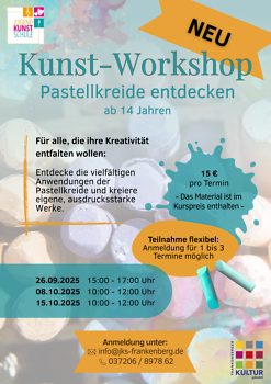 Und noch ein Hinweis. Die JugendKunstSchule bietet neue Kunstkurse an! Hier finden Sie alle Informationen zur Anmeldung: https://kultur-frankenberg.de/veranstaltungen-jugendkunstschule/