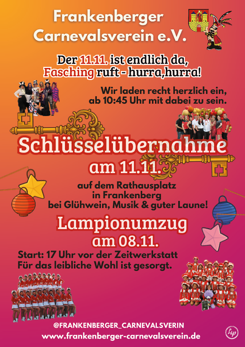 Am 11.11.2025 lädt der Frankenberger Carnevalsverein e.V. zur Schlüsselübernahme ein. Beginn ist 10.45 Uhr auf dem Marktplatz.