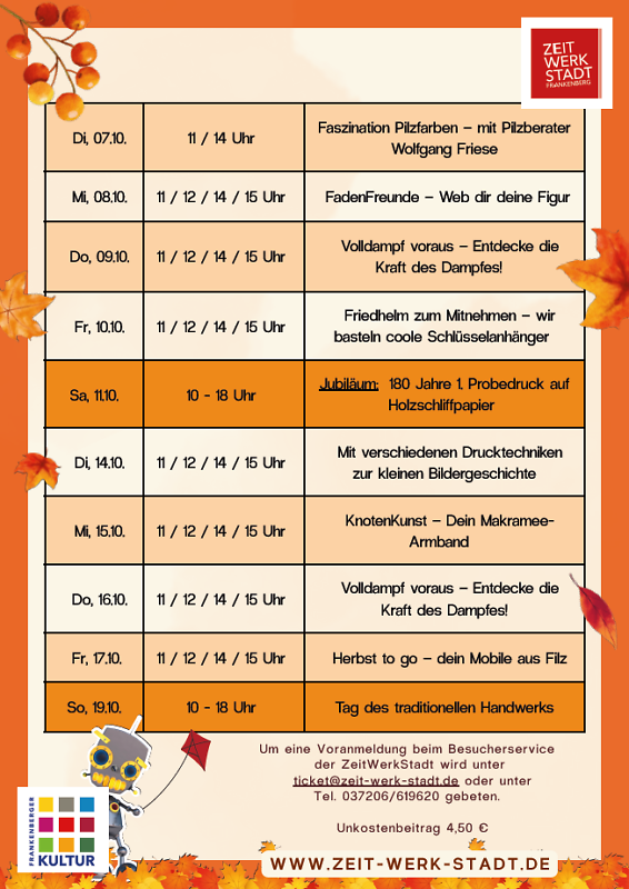 Die Teilnahme an den Workshops ist für einen Unkostenbeitrag von 4,50 € möglich. Die Plätze sind begrenzt, daher wird um eine Vorab-Anmeldung beim Besucherservice unter ticket@zeit-werk-stadt.de oder telefonisch unter 037206/619620 gebeten.