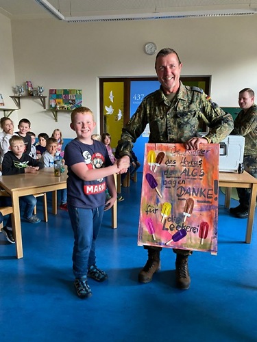 Doch wer hatte nun diesen Gedanken? Die Bundeswehr- PzGrenBrig 37 schon seit mehreren Jahren arbeiten wir mit ihnen zusammen. Sie unterstützen uns bei der Durchführung von Veranstaltungen für unsere Kinder und spendeten auch an diesem besonderen Tag das Eis. Unsere Kinder waren beeindruckt, aber auch nachdenklich. Ein Kind fragte sogar warum sie das Eis bekommen und nicht die Kinder in Afrika oder Indien. Das ging schon unter die Haut.