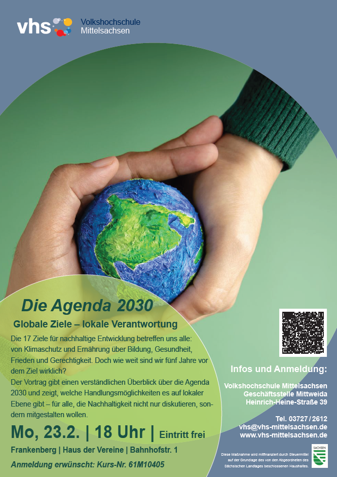 Das Angebot ist entgeltfrei. Um eine Anmeldung im Vorfeld wird gebeten. Informationen zu Kursinhalten und Anmeldung finden Sie unter: https://www.vhs-mittelsachsen.de/kurs/mensch-und-gesellschaft/politik-und-buergerbeteiligung/die-agenda-2030-internationale-aufgabe-und-lokale-herausforderung/61M10405