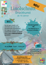 Mit speziellem Werkzeug wird ein Negativmuster in eine Linoleumplatte geschnitten, welches danach mit Farbe überwalzt und auf das Papier gedruckt wird. So gestalten wir eigene Weihnachtskarten!