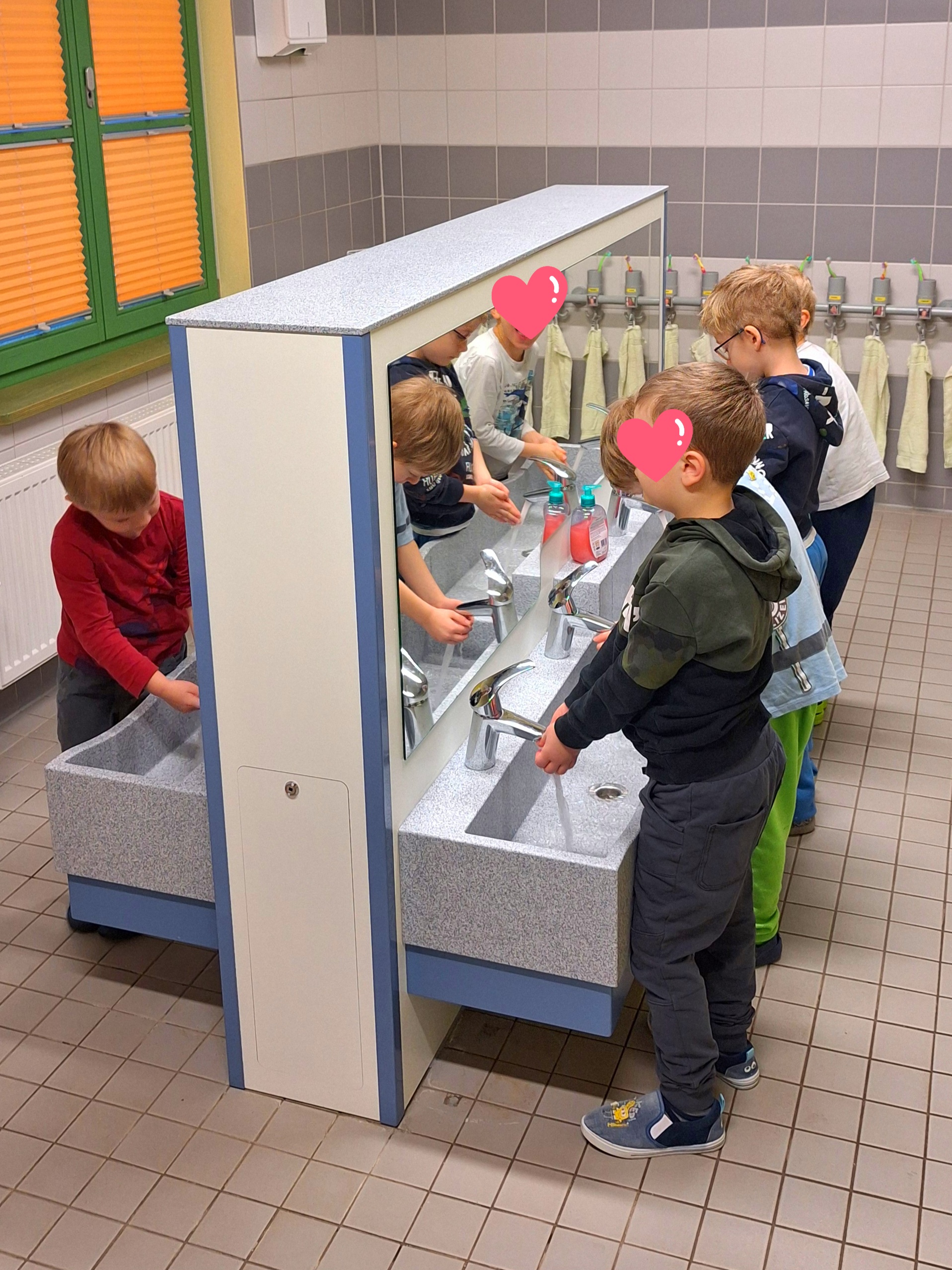 Es ist immer wieder eine Freude, wenn wir so eine super Zusammenarbeit aller Beteiligten erleben und wenn wir dadurch für Kinder optimale Lernbedingungen schaffen dürfen. Jeder Cent ist super angelegt, denn Händewaschen und Zähneputzen will gelernt sein! Und so ein Waschbecken ist noch mehr als ein Lernort für Körperpflege - es ist ein Zentrum für Sensorik: denn Wasser bietet unglaublich viele Reize! Diese Reize faszinieren Kinder und können inneren Stress und Anspannung sogar reduzieren. Im Wasser matschen regt die Phantasie an und macht den Kindern großen Spaß. An den neuen Waschtischen macht das Lernen auf jeden Fall Spaß - und gut aussehen tun sie natürlich auch!