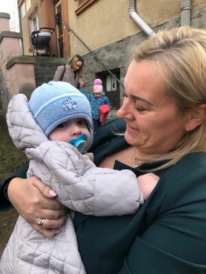 Dorota Pawnuk, Bürgermeisterin von Strzelin, hält ein ukrainisches Flüchtlingskind im Arm.