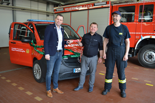 Bildunterschrift: Die Freiwillige Feuerwehr Frankenberg/Sa. erhielt am Montag einen neuen Mannschaftstransportwagen (MTW). Bei der Schlüsselübergabe: Erster stellvertretender Bürgermeister Andreas Schramm, Raphael Schmidt (Schloz & Wöllenstein) und Stadtwehrleiter Michael Knoth (v.l.n.r.).