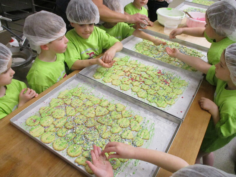 Als die kleinen Abenteurer in der Backstube ankamen, wurden sie von Herr Selbmann und Frau Lämmel herzlich empfangen. Frau Lämmel trug ihre große Schürze und hatte ein lustiges Häubchen auf dem Kopf, dass sah nach Spaß aus. Mit frisch gewaschen Händen, Pippi T-Shirts und Häubchen auf dem Kopf ausgestattet, schauten sich die Kinder um und entdeckten riesige Säcke voller Mehl, bunte Streusel und köstliche Zutaten. Oh, wie verführerisch es roch!