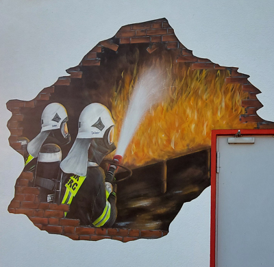 Schon seit längerer Zeit hegte sich unter den Kameradinnen und Kameraden der Wunsch, unserem Feuerwehr-Gerätehaus einen neuen Farbtupfer zu verpassen, um die doch etwas trist wirkende und in die Jahre gekommene weiß-rote Fassade am Funktionsgebäude zu individualisieren. Den finalen Anstoß brachte die Arbeit von Marian Damisch (Firma Andreas & Thomas Teuchner Malermeister), welcher im Juni 2023 in Sichtweite des Gerätehauses einen Feuerwehrmann auf einem Verteilerkasten porträtierte.