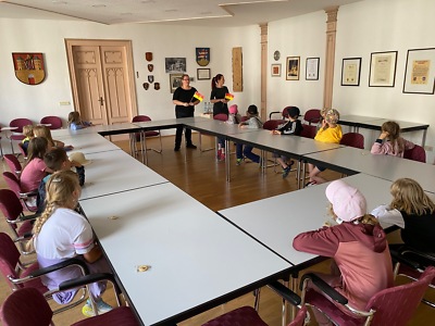 Die Tour begann im Büro des Bürgermeisters, wo die Kinder die Möglichkeit hatten, den Arbeitsplatz des Stadtoberhauptes zu besichtigen. Die Begeisterung war groß, als sie den Schreibtisch des Bürgermeisters unter die Lupe nahmen und einen Blick auf die vielen Dokumente und Aufgaben warfen, die dort täglich bearbeitet werden. Im Anschluss daran führte der Weg in den beeindruckenden Ratssaal. Hier durften die jungen Parlamentarier einmal selbst Platz nehmen und das Gefühl erleben, wie es ist, im Stadtrat zu sitzen und über wichtige Angelegenheiten zu diskutieren und abzustimmen.