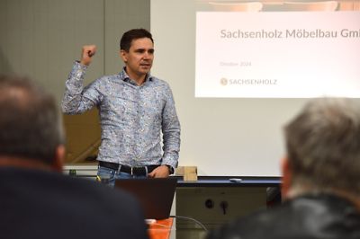 Was macht eigentlich Sachsenholz Möbelbau? Diese Frage wurde zum Frankenberger Wirtschaftsstammtisch am 29.10.2024 beantwortet. Der Geschäftsführer des jungen Unternehmens, Andreas Glöß, stellte den etwa 25 anwesenden Teilnehmern die Geschäftsfelder (Herstellung von Maßmöbeln, Ladenbau und Elementbau) vor.