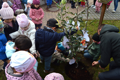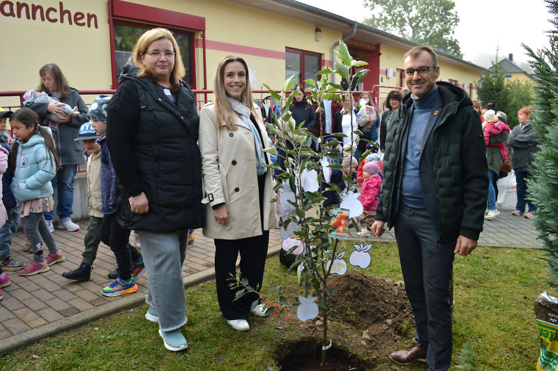 Eine Woche lang feierte die DRK-Kindertagesstätte „Heinzelmännchen“ in Sachsenburg ihr 70-jähriges Bestehen. Höhepunkt der Feierlichkeiten war die Pflanzung eines Apfelbaumes (Cox Orangen Renette) vor der Einrichtung am 02. Oktober 2025 mit Bürgermeister Oliver Gerstner. Unterstützung bekam er von den Kindern der Einrichtung, deren selbst gestaltete Äpfel den Baum verzierten.