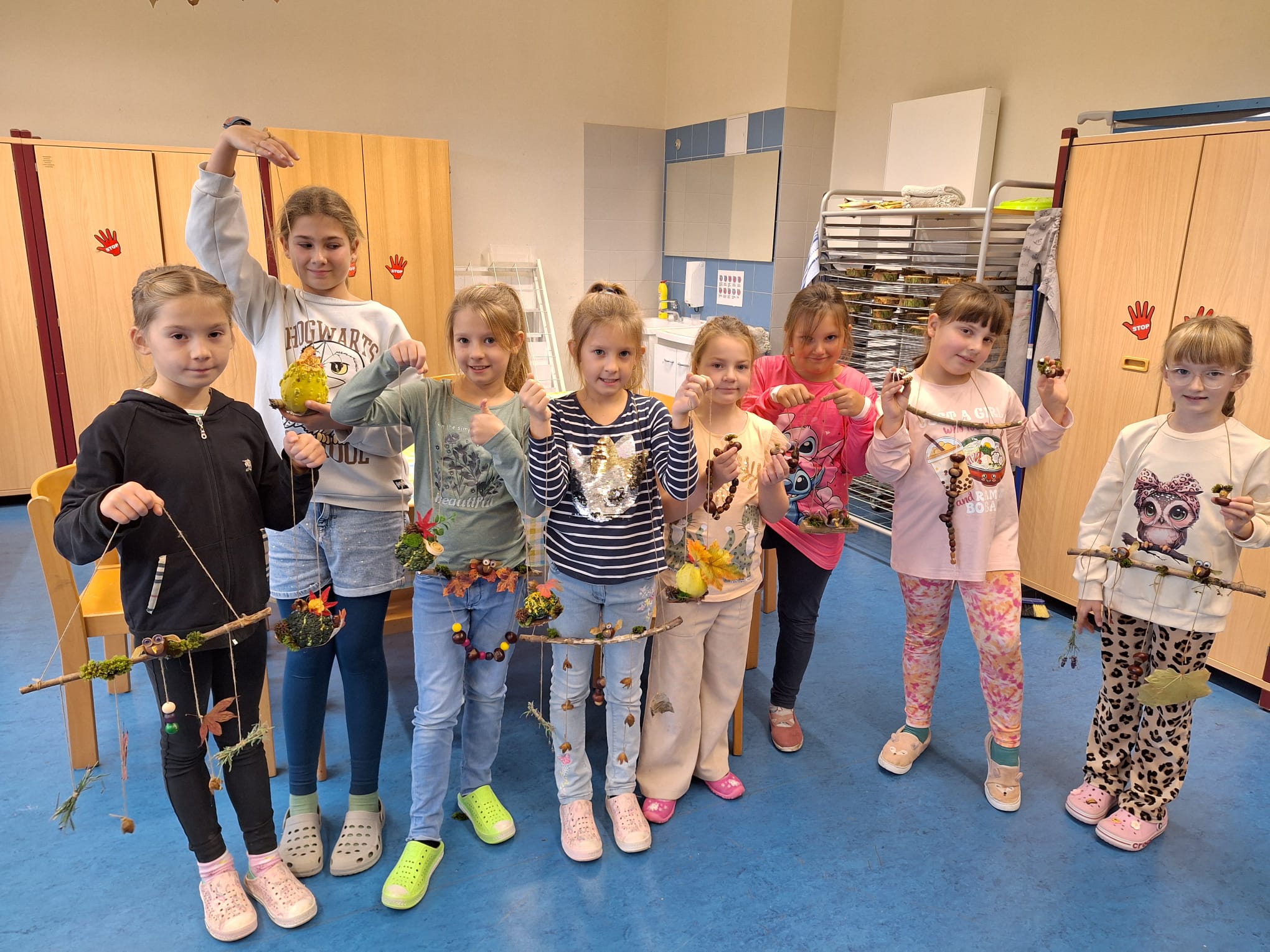 Insgesamt können wir sagen: Unsere Herbstferien waren trotz des vielen Regens wirklich schön. Wir haben viel erlebt, gekocht und verarbeitet … vor allem das Obst und Gemüse, das wir von den Eltern geschenkt bekommen haben. Vielen Dank dafür. Auch aus vielen Kastanien, Blättern, Rinde und anderen Naturmaterialien sind viele hübsche Dekostücke entstanden und zieren jetzt so manches Kinderzimmer.