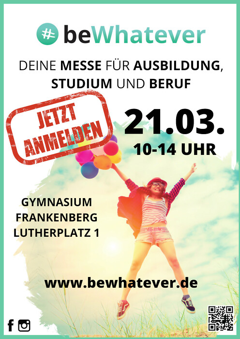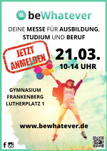 Für die am 21.03.2026 im Martin-Luther-Gymnasium stattfindende #beWhatever - Deine Messe für Ausbildung, Studium und Beruf, organisiert vom Bildungsverein Frankenberg/Sa. e.V. wurde die Anmeldung unter https://www.bewhatever.de freigeschalten. Die Veranstaltung ist eine der größten ihrer Art in der Umgebung mit mehr als 100 Teilnehmern.