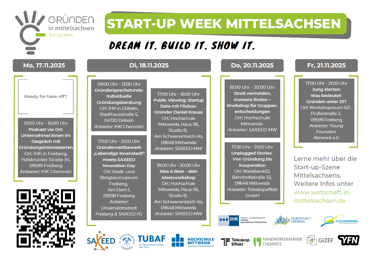 Vom 18. bis 23. November 2025 findet in Mittelsachsen die Gründerwoche Deutschland unter dem regionalen Titel Startup Week Mittelsachsen statt. Die Aktionswoche bietet ein vielfältiges Programm für Gründungsinteressierte, junge Unternehmen und alle, die sich mit dem Gedanken tragen, beruflich neue Wege zu gehen.