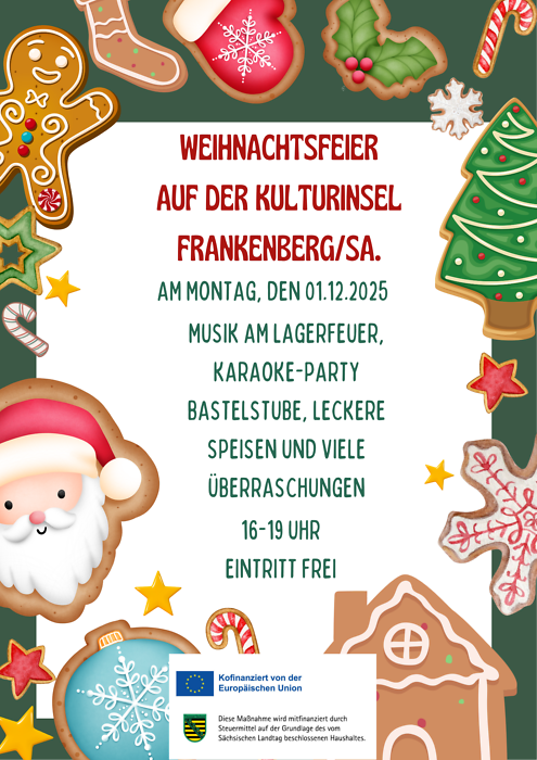 Am Montag, den 01.12.2025 lädt die Kulturinsel ein zur Weihnachtsfeier. Von 16.00 bis 19.00 Uhr gibt es Musik am Lagerfeuer, eine Karaoke-Party, Bastelstube, Leckereien und jede Menge mehr Überraschungen. Der Eintritt ist frei.