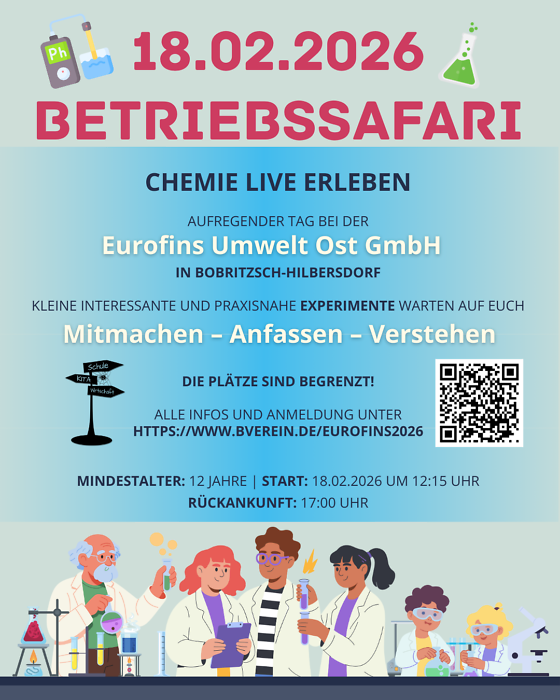 Am 18.02. bietet der Bildungsverein einen Ausflug zur Eurofins Umwelt Ost GmbH in Bobritzsch-Hilbersdorf an. Hier erwarten die Kids (ab 12 Jahre) 3 spannende Stunden mit Erkundung und kleinen interessanten und praxisnahen Experimenten.