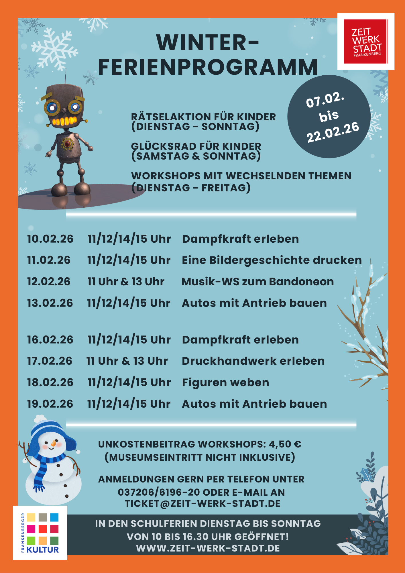 Die ZeitWerkStadt Frankenberg/Sa. lädt in den Winterferien vom 7. bis 22. Februar 2026 zu einem abwechslungsreichen Programm für Familien und Kinder ein. Mit spannenden Mitmachaktionen, faszinierenden Experimenten und kreativen Workshops bietet das Museum in der kalten Jahreszeit jede Menge Spaß, Wissen und Entdeckerfreude für kleine und große Gäste.