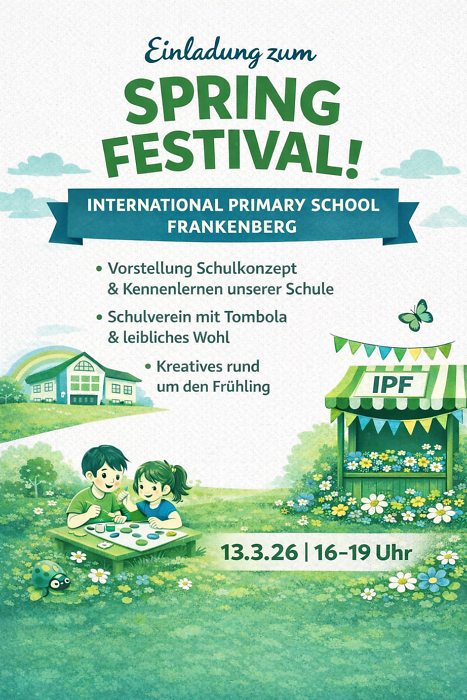 Am 13.03.2026 lädt die International Primary School Frankenberg zum Spring Festival ein. Im Zeitraum von 16 bis 19 Uhr können Interessierte das Schulkonzept, die Schule und vieles mehr kennen lernen.