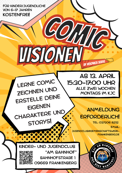 Lerne Comic zeichnen und erstelle deine eigenen Charaktere und Storys. Ab 13. April 2026, in der Zeit von 15.30 Uhr bis 17.00 Uhr, alle zwei Wochen montags im Kinder- und Jugendclub "Am Bahnhof". Anmeldung erforderlich unter Tel.: 037206-82112, E-Mail: jugendclub@gemeinschaftswerk-frankenberg.de