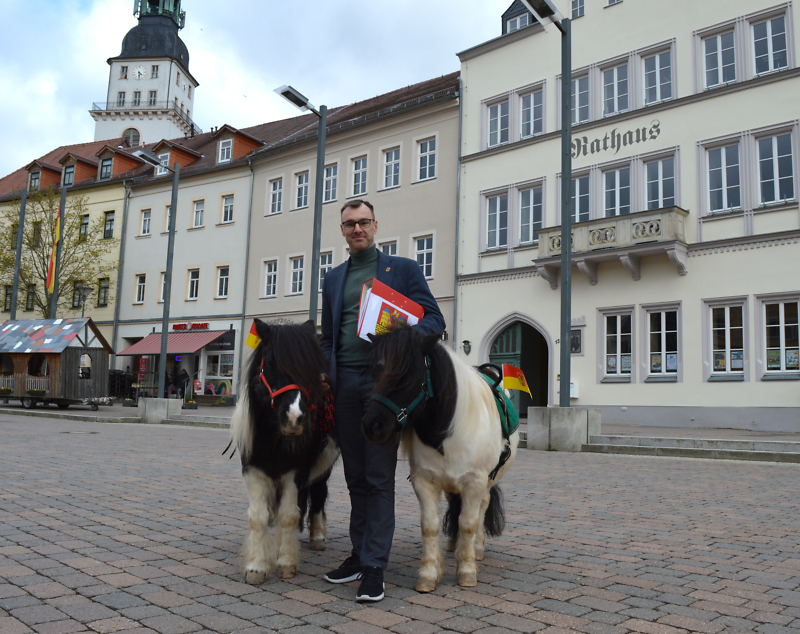 Im oberen Bild: Ponys: Greta (links), Willow (rechts) unterstützen das neue Huf- und Galoppmanagement in der Stadtverwaltung Frankenberg/Sa. Bürgermeister Oliver Gerstner heißt die beiden herzlich willkommen.