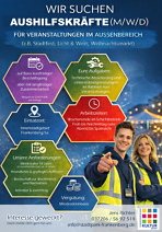 Das ORG-TEAM der FKG sucht Aushilfskräfte (m/w/d) für Veranstaltungen im Außenbereich (z.B. Stadtfest, Licht & Wein, Weihnachtsmarkt) auf Basis kurzfristiger Beschäftigung aber mit langfristiger Zusammenarbeit.