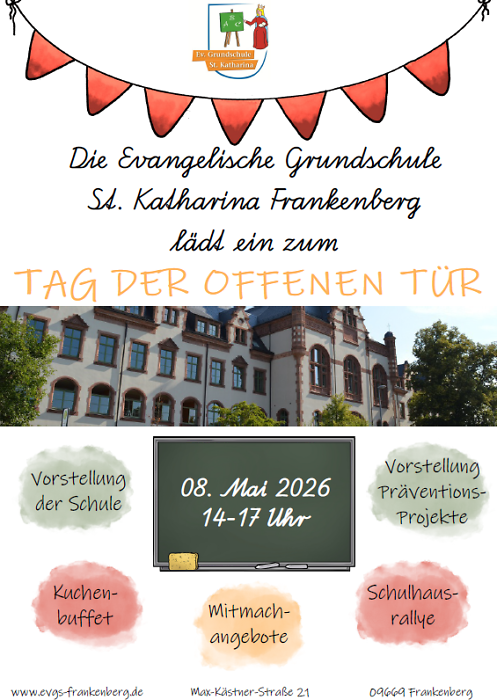 Die Evangelische Grundschule St. Katharina Frankenberg lädt ein zum Tag der offenen Tür am 08. Mai 2026 von 14.00 bis 17.00 Uhr.